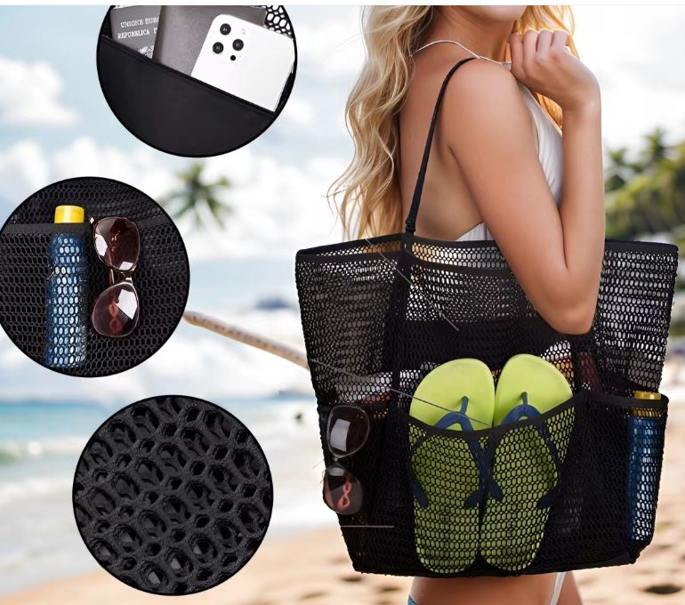 無論是海灘度假、泳池派對或戶外休閒,這款時尚沙灘袋都能輕鬆收納您的所有裝備。採用耐用透氣網布材質,防沙、防潮、速乾,兼具實用與時尚外型,是夏日必備的隨行包款。