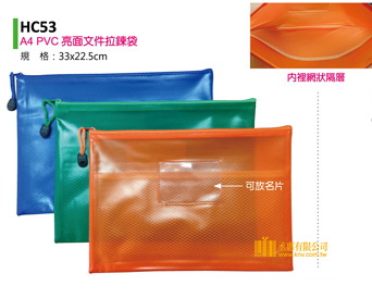 HC53 PVC亮面文件拉鍊袋 A4 ( 33*22.5CM) HC54 PVC亮面文件拉鍊袋 A5 ( 29*20.5CM) 內裡網狀隔層 有放名片處 可印刷LOGO 歡迎來信或電話詢問