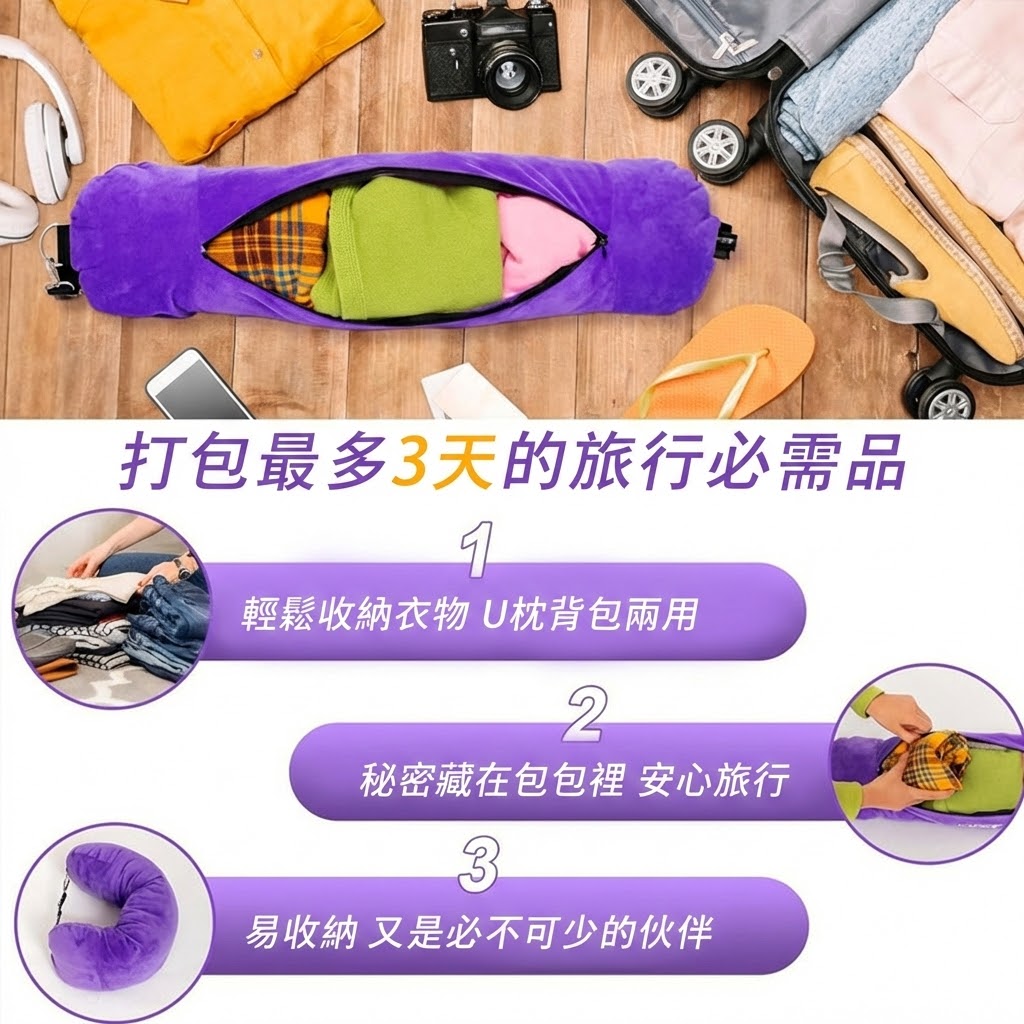 超級收納護頸枕 你的行李精簡神器 可裝 3 天衣物 U 枕+收納包一枕二用 隱藏式打包更安心 輕量柔軟、必備旅伴 說走就走,一枕搞定!